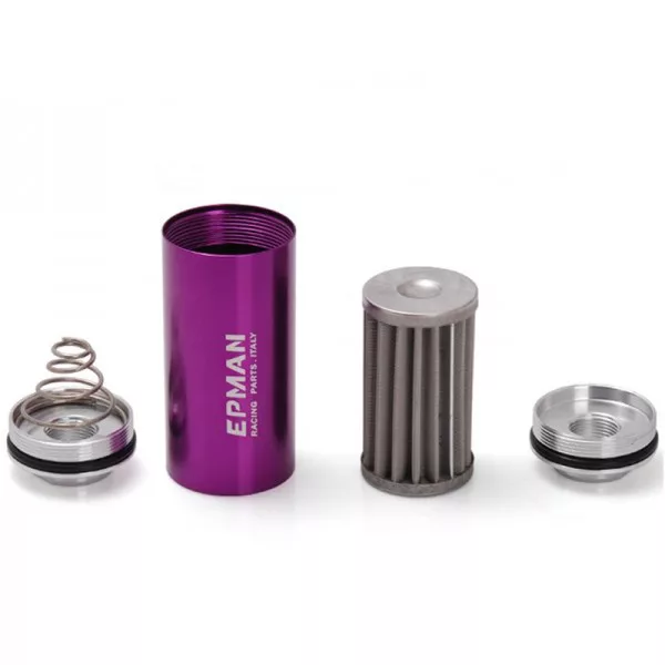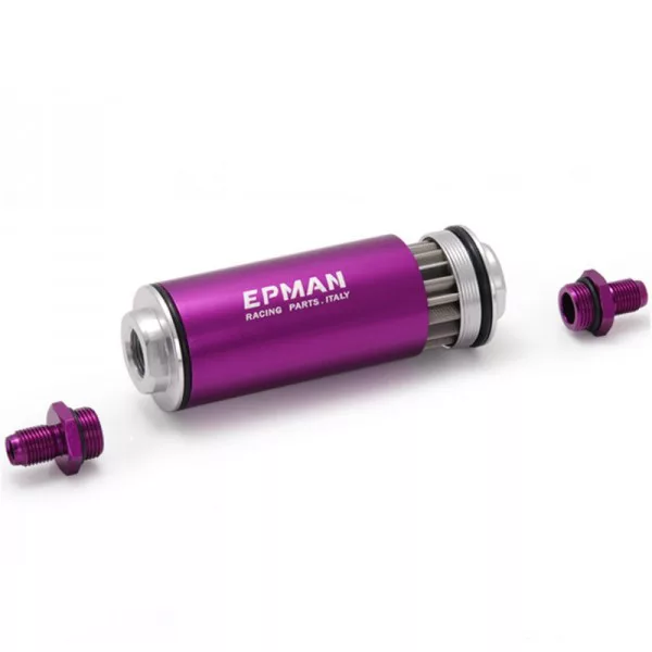 The EPMAN racing in-line fuel filter AN10 purple is an external fuel filter designed for AN10 fuel plumbing. The purple anodised housing is made from 6061 aluminium, while the internal element is a Stainless Steel (100 Micron) filter.