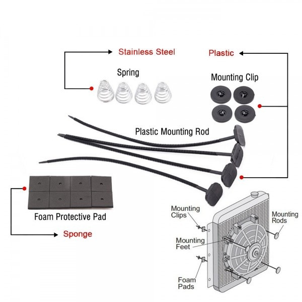 The kit uses plastic push-through mounting hardware, and the package includes mounting rods, foam protective pads, springs and retaining clips. This layout is useful when the fan or cooling accessory needs to be mounted directly to the radiator core in a compact installation area.
