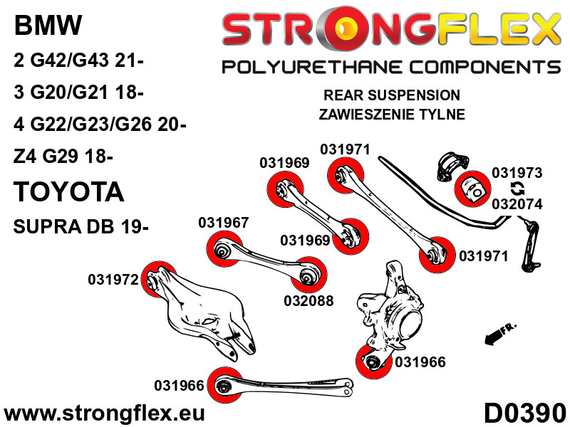 - This bush is only available in 90ShA hardness (yellow) because the original rubber bush is made of a hard rubber compound. The use of the 80ShA hardness bush (red) will reduce the driving of the car to the original rubber bush.