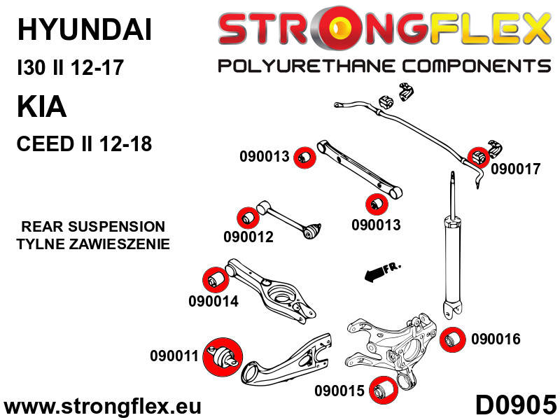 • This bush is only available in 90ShA hardness (yellow) because the original rubber bush is made of a hard rubber compound. The use of the 80ShA hardness bush (red) will reduce the driving of the car to the original rubber bush.
