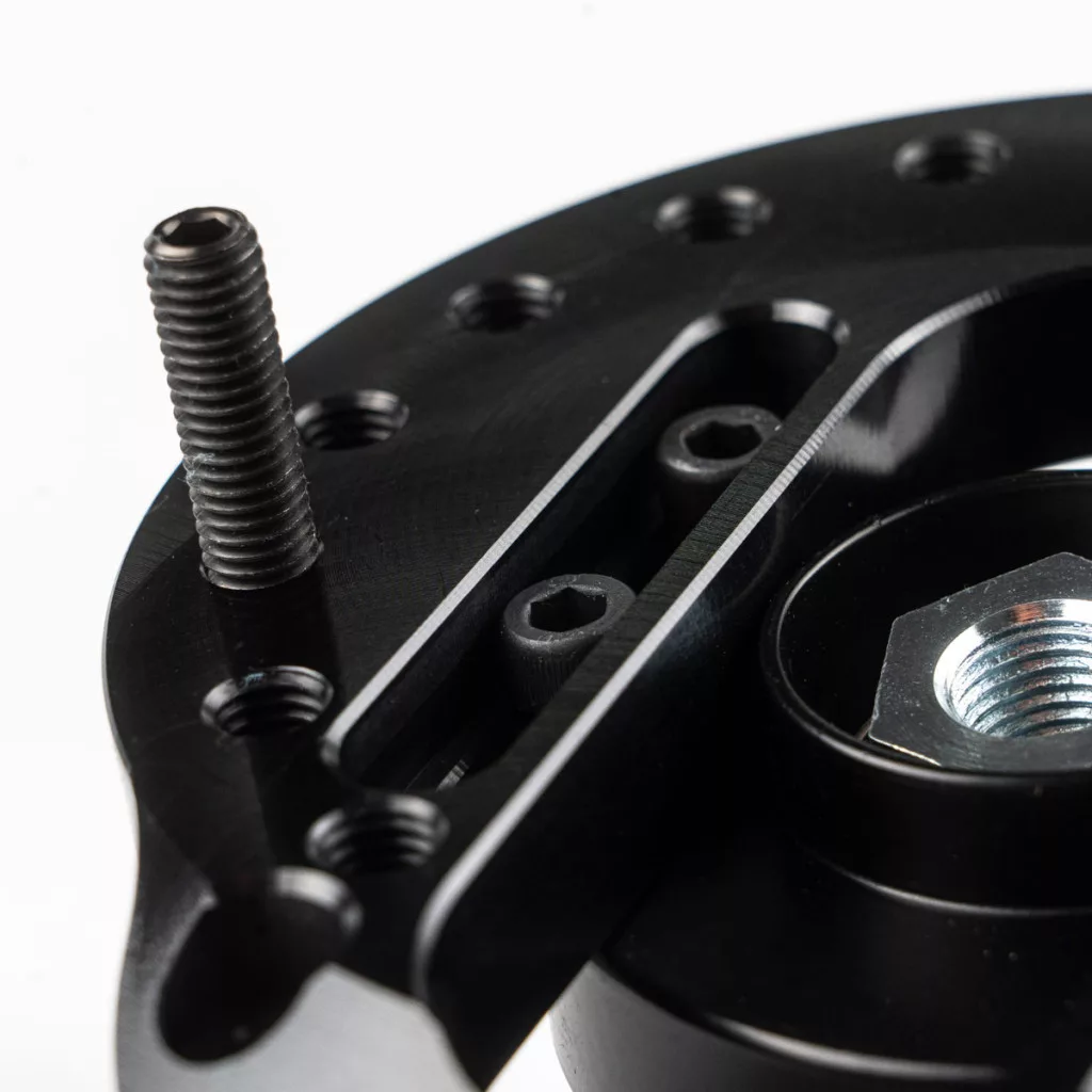 Stainless steel spacer sleeves are included. Thanks to its length, the lower bushing prevents collision with the spring plate when the shock absorber swings a lot. The upper bushing serves as a nut, thus avoiding problems with a threaded connection that is too short.