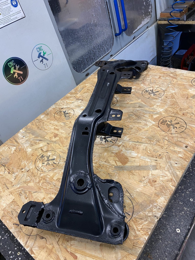 The kit strengthens and stiffens the front beam of the BMW E30.