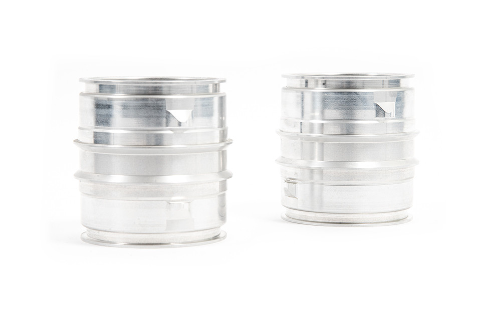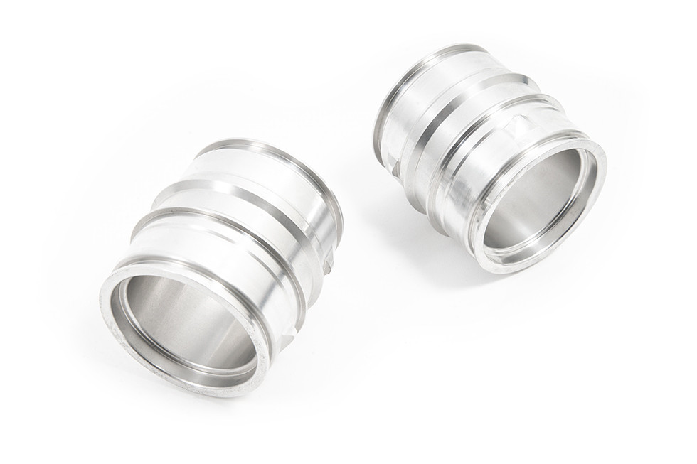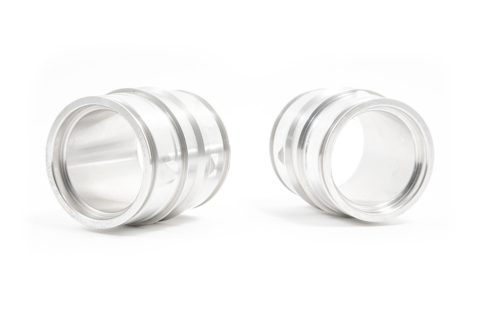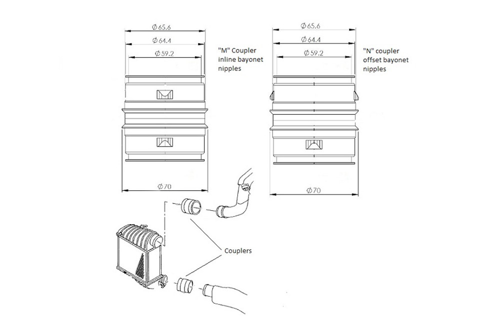 A pair of alloy male to male bayonet style 65mm couplers. One coupler has inline bayonet nipples and the other offset. This pair of couplers replace the pressed steel hose couplers that are found on the VW / Audi/SEAT/Skoda 130 hp diesel engines ( ASZ engine code). The couplers connect the boost pipework to the intercooler ( see diagrams below ) This replacement eliminates the problem of the OEM couplers blowing apart. This upgrade is advisable to all software upgraded, or tuned engines and higher mileage standard vehicles.