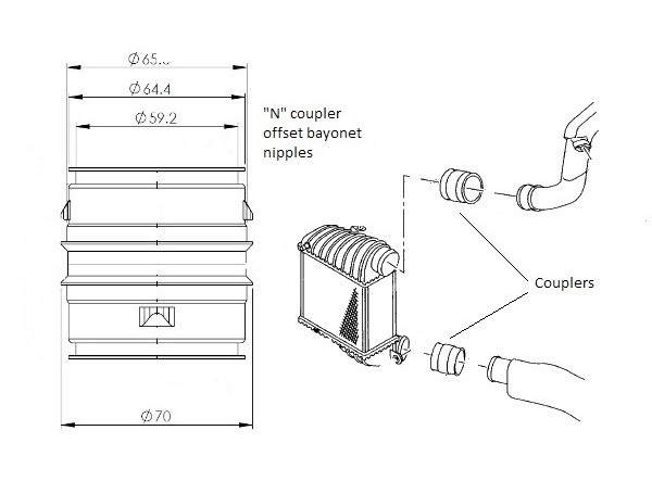 This coupler replaces the pressed steel hose coupler that is found on the VW / Audi/SEAT/Skoda 130 hp diesel engines ( ARZ engine code). The coupler connects the boost pipework to the intercooler ( see diagrams below ) This replacement eliminates the problem of the OEM couplers blowing apart. This upgrade is advisable to all software upgraded, or tuned engines and higher mileage standard vehicles. Please note Two couplers are required of different design "M" and "N" These can either be purchased separately or together ( pt. no.FMABHCMN ) at a reduced cost.