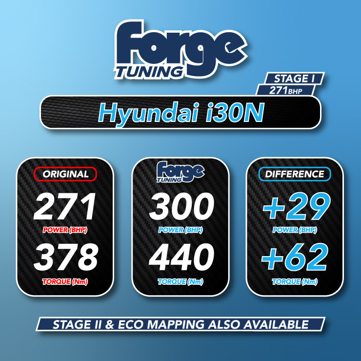 Our stage 1 ECU calibrations for Gen 1 vehicles allows power and torque to be increased from Hyundai’s claimed 271bhp/378Nm to over 300bhp/440Nm, a gain of +29 BHP & +62Nm.