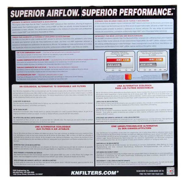 K&N® washable, reusable High-Flow Air Filters™ feature a state-of-the-art design of layered, oiled cotton media engineered to improve airflow and capture contaminants, and are designed to provide an increase in horsepower.