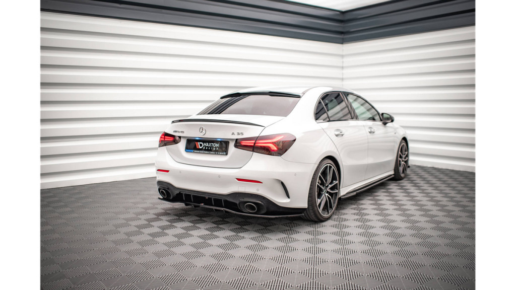 The Mercedes A 35 AMG Sedan V177 central rear splitter shows an aesthetic form and will constitute a striking addition to your machine. The installation of this product will cause visual lowering of the bodywork which contributes to that slick modern racing look. This element is the most presentable alongside side skirts and a front splitter. It comes in carbon, gloss, or textures surface structure varieties. You an also purchase a red or white decorative stripe to further personalize your tuning.