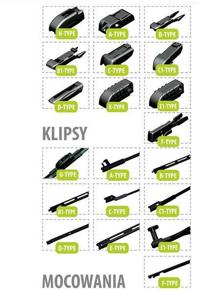 CUSTOM WIPERS - ALL IN ONE MULTI-ADAPTER MULTI-TYPENon-standard wipers - 375mm multitype all-in-one. Feathers without a skeleton structure with an integrated spoiler, windshield wipers made of a silicone-rubber mixture. The metal parts are made of durable High-Carbon steel, fully galvanized to protect against corrosion for a long time and effectively. They have 10 types of interchangeable fittings: U, A, B, B1, C, C1, D, E, E1, F - fit according to . directory. They have a symmetrical double-sided spoiler, thanks to which they also fit cars with the steering wheel on the right side as well as cars with a counter-wiping system.