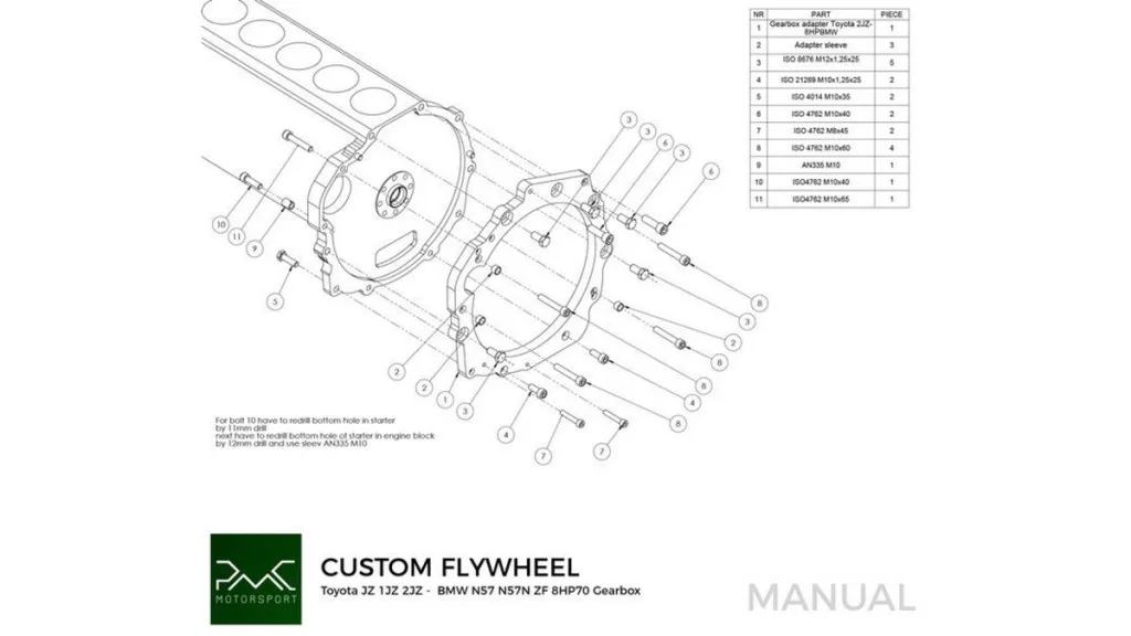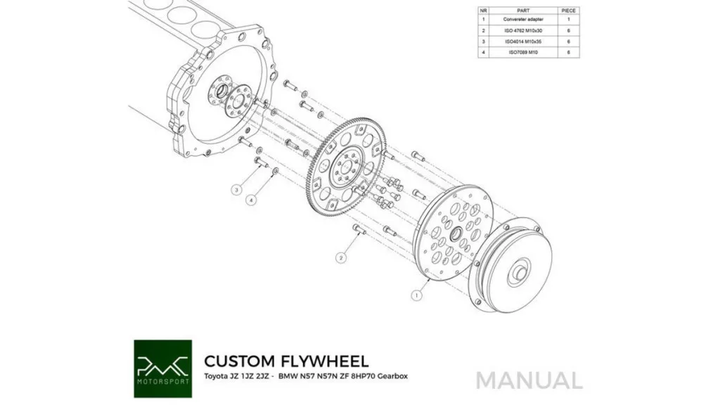 - Use the flywheel / ring gear from the automatic version and one spacer (OE 32116-22020 4.5mm) between the engine block and the flexplate