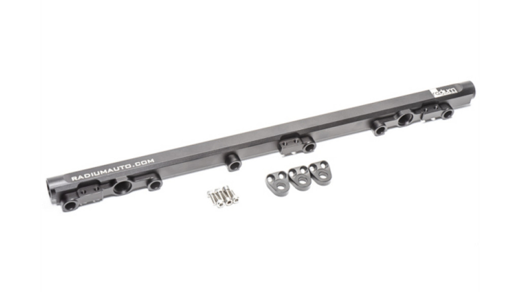 Ports accept Radium pulse dampers, pressure gauges, on-rail FPRs, and AN fittings (optional accessories).