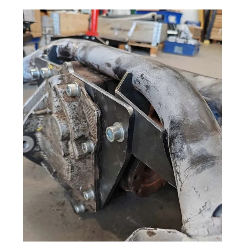 The set eliminates the "famous" bushing no. 9 from the beam, which must be cut off from the beam. In its place, two additional mounts for the differential are welded to the beam. The differential should be assembled in a so-called "sandwich" manner, screwed to the beam using the front bolts, and the mounts welded. The mounts must be welded "in front of the differential" to allow for possible later removal (as shown in the photo).