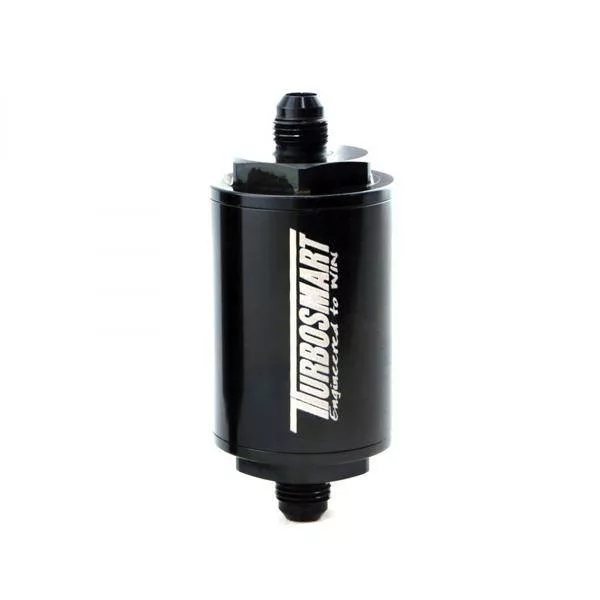 Turbosmart Billet Inline Fuel Filter 1.75" OD (45mm) and 3.825" (97mm) Long with AN-6 male inlet and outlet fittings.