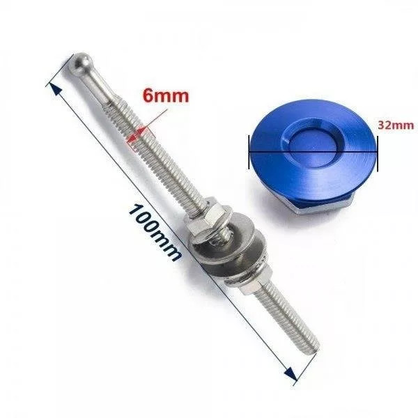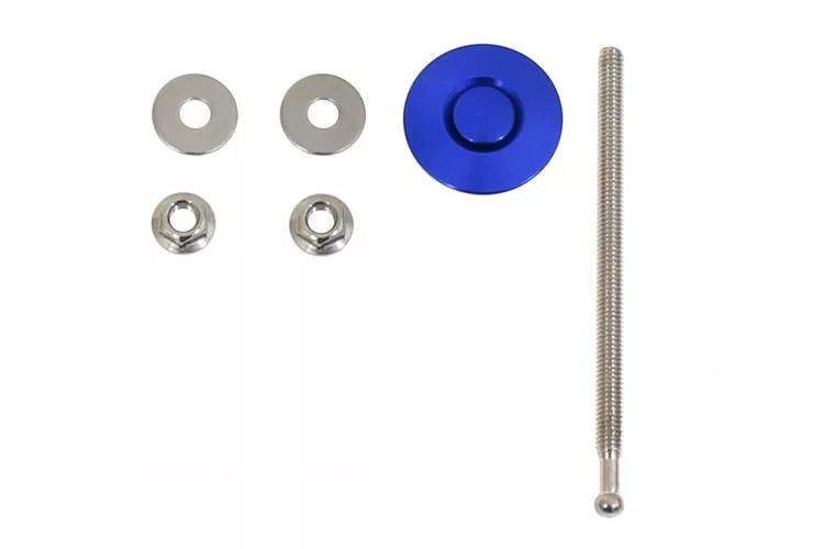 The universal aluminum push button hood latch 32mm is designed for lightweight hoods such as carbon fiber or OEM fiberglass panels. Its 32 mm latch head gives a compact appearance, while the 100 mm mounting stud supports a range of installation layouts.