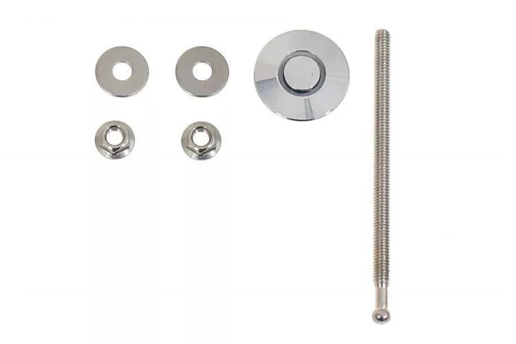 The universal aluminum push button hood latch 32mm is designed for lightweight hoods such as carbon fiber or OEM fiberglass panels. Its 32 mm latch head gives a compact appearance, while the 100 mm mounting stud supports a range of installation layouts.